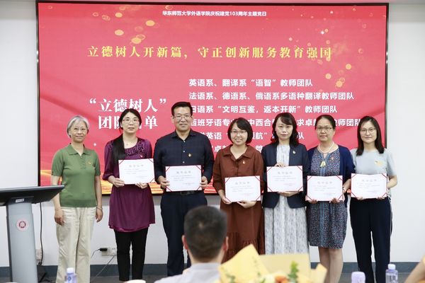 为充分发扬教育家精神,更好地对接服务国家战略,推进高素质专业化创新型高校外语教师队伍建设,威尼斯9499登录入口党委组织各教工党支部联合系部建设“立德树人”教师团队。会上,校党委教师工作部常务副部长卢波为 “立德树人”教师团队颁发证书。各教师团队围绕新时代“一融双高”的实践进路开展充分研讨,并从师德师风、教育教学、科研创新、社会服务、团队建设等方面进行交流汇报。
