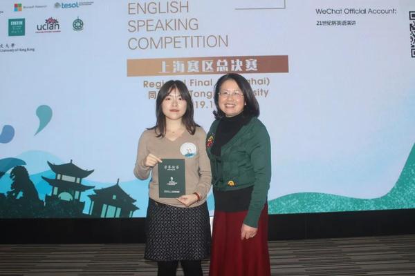 On Nov, 30th, the final of the 25th 21st Century Cup National English Speaking Competition Shanghai area was held in the hall of Yifu Building, Tongji University. After fierce competition, Wang Yan, a law major student, winning the grand prize((the highest award))gained access to the national final. Zhong Jiaqi, an English major student, was awarded the first prize.