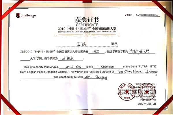 From December 9th, 2019 to December 13th, 2019, “FLTRP·ETIC Cup” English Public Speaking Contest was held in the international conference center of Beijing Foreign Studies Press. 180 contestants from all over the country competed together. After a five-day and four-round fierce competition, Wang Yan,a law major student from ECNUcoached by Dr. Zhao Chaoyong, won the national champion, bringing the university the first national champion in the speech contest Since its first debut in 2002, “FLTRP·ETIC Cup” English Public Speaking Contest has attracted wide attention.It has developed into the highest-level, most-competitive and widely-recognized national speech contest.