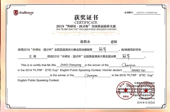 “FLTRP·ETIC Cup” includes English speech contest, reading contest and writing test. Zhao Tianyi from the Spanish major won the national second prize of 2019 reading contest(guided by Xia Ping). Wang Yan’s winning the national speech contest has fully demonstrated the excellent English language abilities of our students and the high professional level of our teachers.