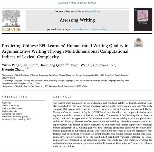 Peng Yuxin, a 2021graduate student of Foreign Languages and Applied Linguistics, published her academic paper Predicting Chinese EFL Learners’ Human-rated Writing Quality in Argumentative Writing Through Multidimensional Computational Indices of Lexical Complexity in the SSCI Zone 1 journal Assessing Writing, with 4.7 impact of Cite Score and 3.164 Impact Factor.